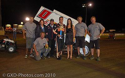 Allard started the night off with the Motor Wear International quick time award by blistering the speedway at an 11.532. After the strong start he wound up flipping in the heat race. From there he started on the pole for the B main event. He went on win the 12-lap race. Allard started in the third row, fifth spot, but by lap two he was in third. On lap six he moved into the second spot when Brett Miller's right front tire tore away from his car and the potent 1x car came to a stop in turn four. Allard chased Kevin Sharrah for the next four laps until he was able to make the pass. Sharrah would stoop a few laps later. At first Sharrah thought it was a rear end problem but during their post race inspection they discovered a drive line problem.
