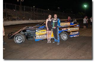 The wingless race was one to remember. Brett Youngman took the early lead during the 20-lap main event. Youngman looked strong up front as the leader. Unfortunately, something failed on the race car and he gave up the lead on lap 13. Rowdy McClennon grabbed the lead while Gary Paulson moved into second. Youngman would stop in turn four a few laps later. When the race resumed it was McClennon up front. He led the race and seemed to be in control until the final lap; however, it was Paulson who would steal the show. Coming out of turn two Paulson had a decision to make. Either go low and finish second or sack it up and try to drive above the cushion and win the race. Thankfully for him and the grandstand crowd he chose the high side. Paulson charged around McClennon to grab the lead coming to the checkered flag. Paulson won the race by half a car length. Travis Moore was third and Angelique Bell was fourth.