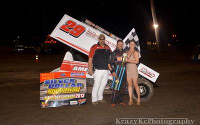 CHICO, CA (4-19-13) -Â Sacramento's Willie Croft led all 25-laps to win the 6th Annual Bill Brownell Memorial Friday night at Silver Dollar Speedway. The traditional race always attracts a strong field of cars and offers a $2500 pay day for the main event win. With the win, Croft has now won two main events in a row. Last Saturday he won at Placerville Speedway. "It felt special to win this race," said Croft. "The whole night went good for us; we qualified fourth, transferred out of the heat and got to start on the front row." Croft drove his Holy Smoke Barbeque/Butler Built/Shark Racing Engines/K&N/FK Rod Ends #29. "My whole Tri C crew and the Lamar family was here tonight so even though I ran my own car it still felt like I am working with a real team," said Croft. Big thanks to Shane Scott and Withrow Motorsports for their continued support of this event.