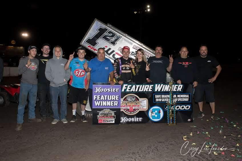 By Jim Allen (Chico, CA) -- Justin Sanders held off the late race advances of Shane Golobic to capture the exciting King of the West-NARC Fujitsu Racing Series 40-lap Dave Bradway Jr. Memorial race at Silver Dollar Speedway Saturday. It was Sanders second win in as many nights at the quarter-mile dirt oval; this one worth $4000, plus over $1000 in lap money.