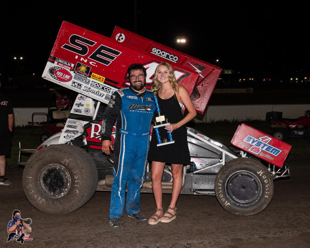 (Chico, CA 4-30-21)…Fresno’s Dominic Scelzi won the 25-lap, $3,000 to win Bill Brownell Memorial Friday night at Silver Dollar Speedway. A record amount of winged sprint cars attended the first night of the Sprint Nationals with 61 competitors signed into the pit area. The dwarf cars brought 28 drivers to the show. The local street stocks had seven drivers. In all, 96 total cars were on hand to welcome back the fans, who were also allowed back after a 413-day absence. It was a spectacular welcome back party to Silver Dollar Speedway.